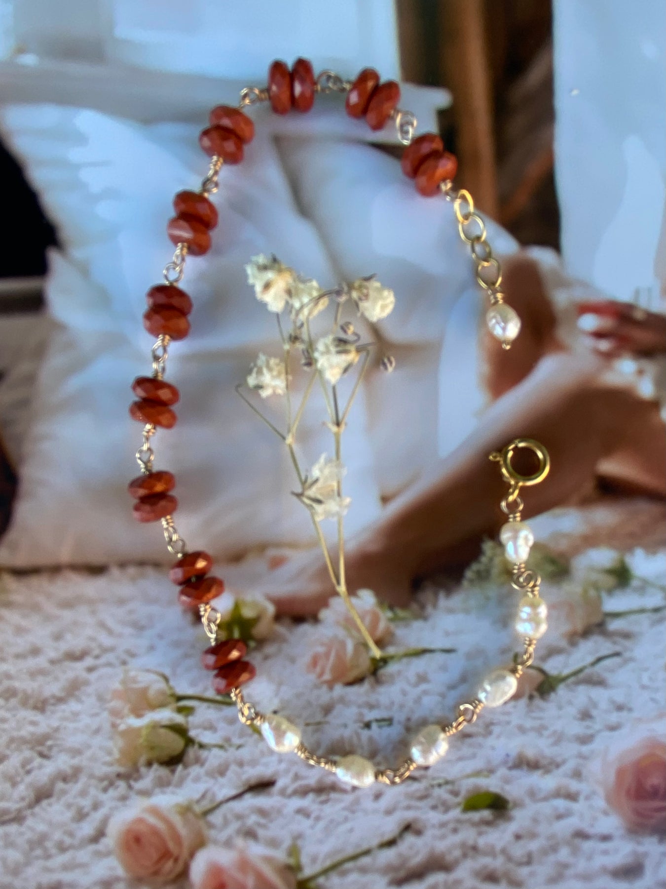 Warm carnelian stones meet soft pearls for a piece that glows with quiet confidence.
