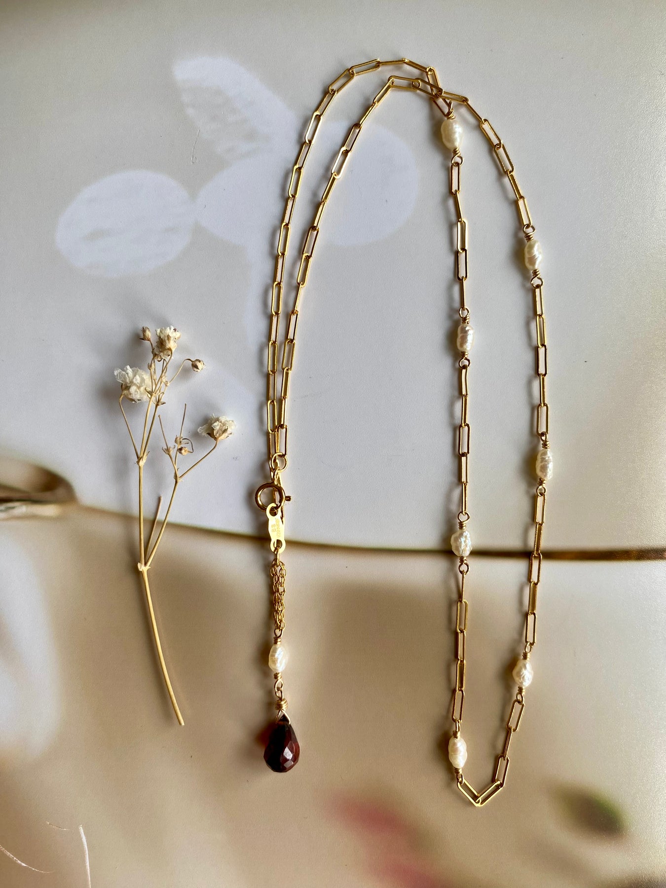 A bold gold chain softened with luminous pearls and a dramatic drop at the clasp, made to feel confident, effortless and quietly striking.