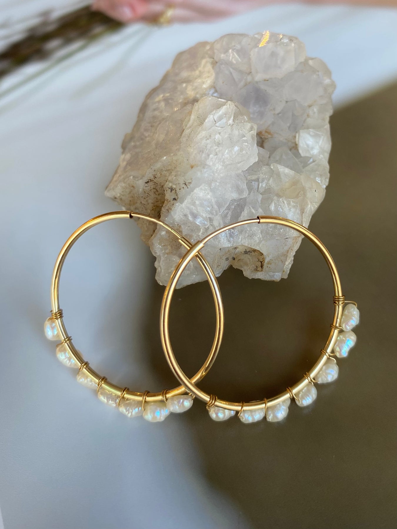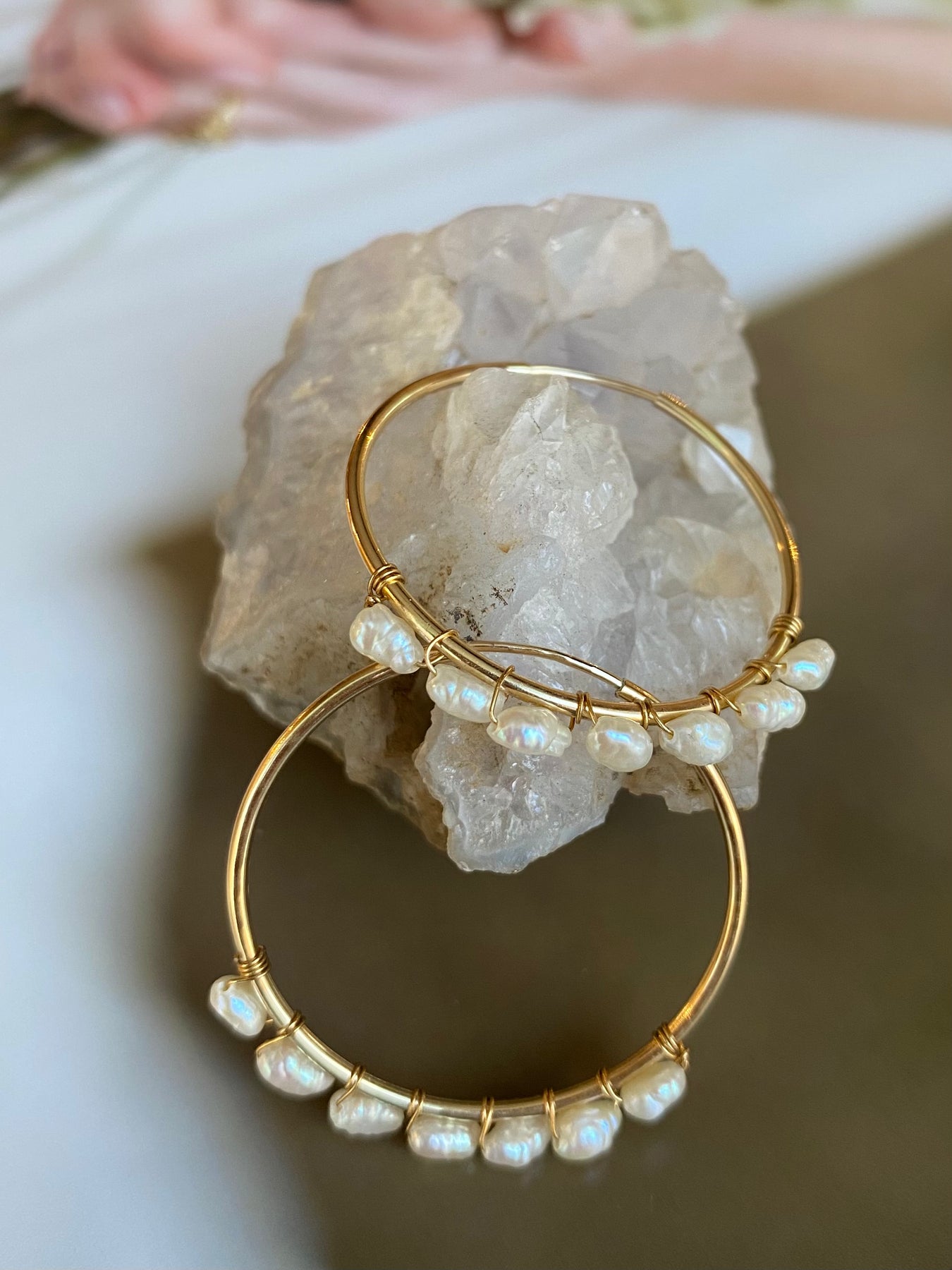 Soft, luminous pearls dancing along golden hoops, catching the light with every turn.