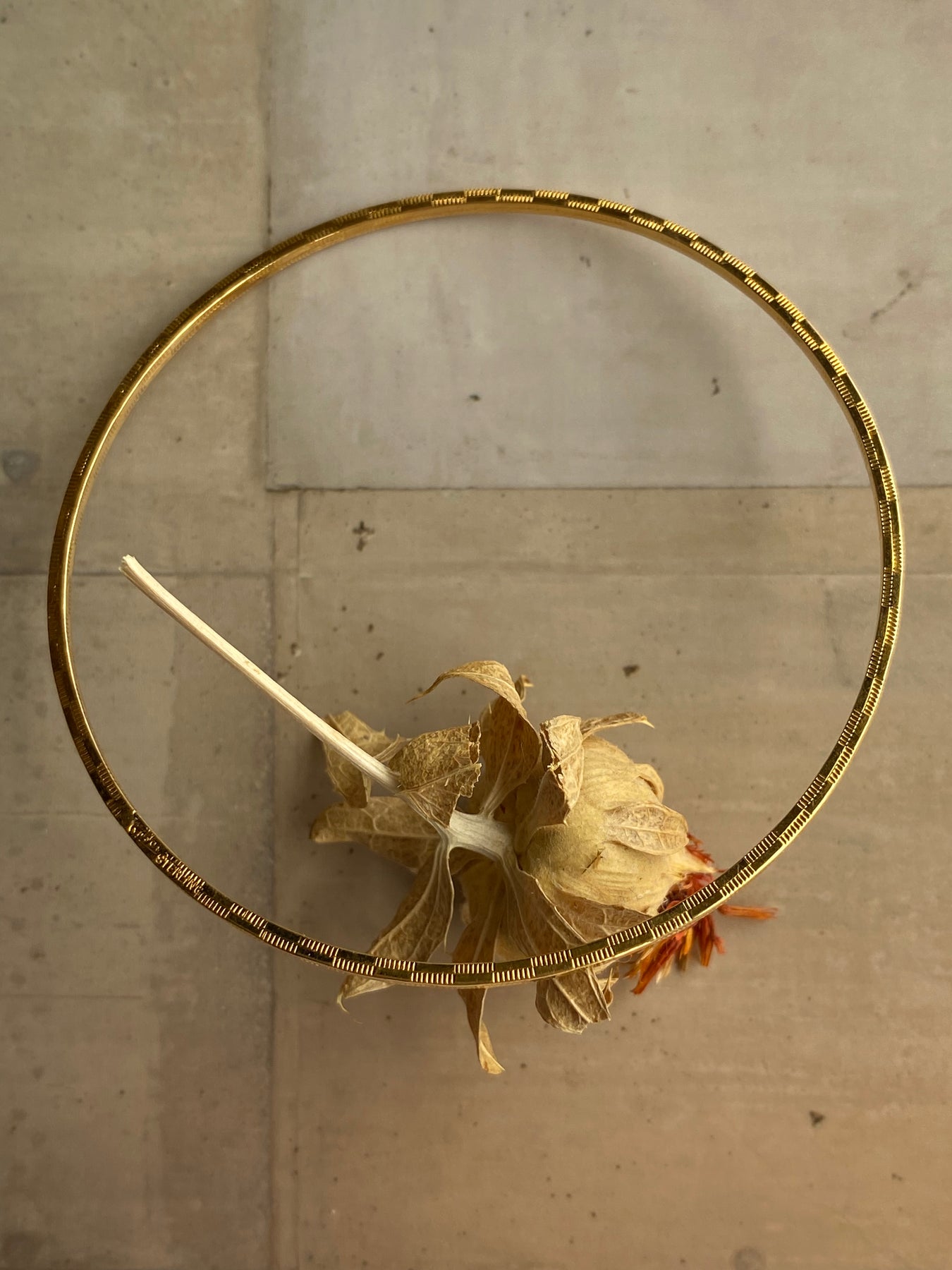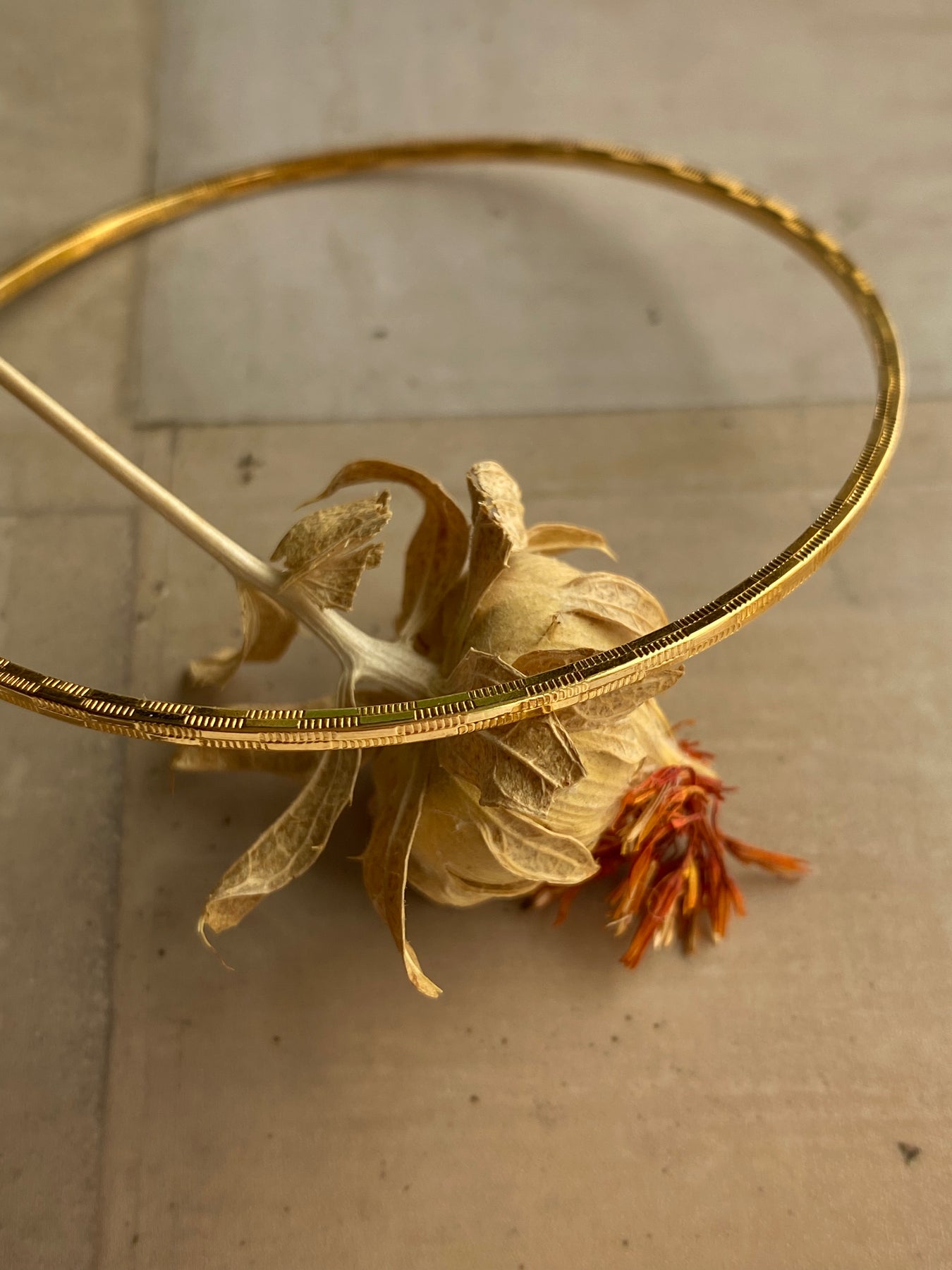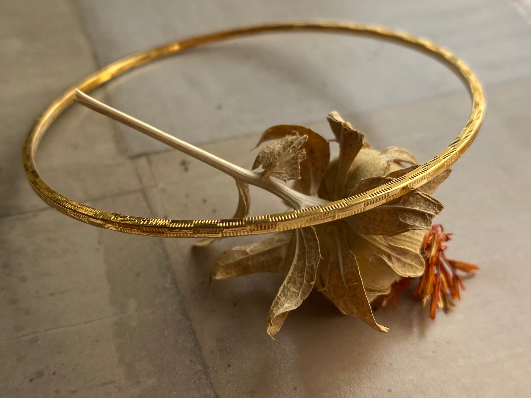 A refined gold toned bangle with subtle texture, made to glow softly and effortlessly with every movement.