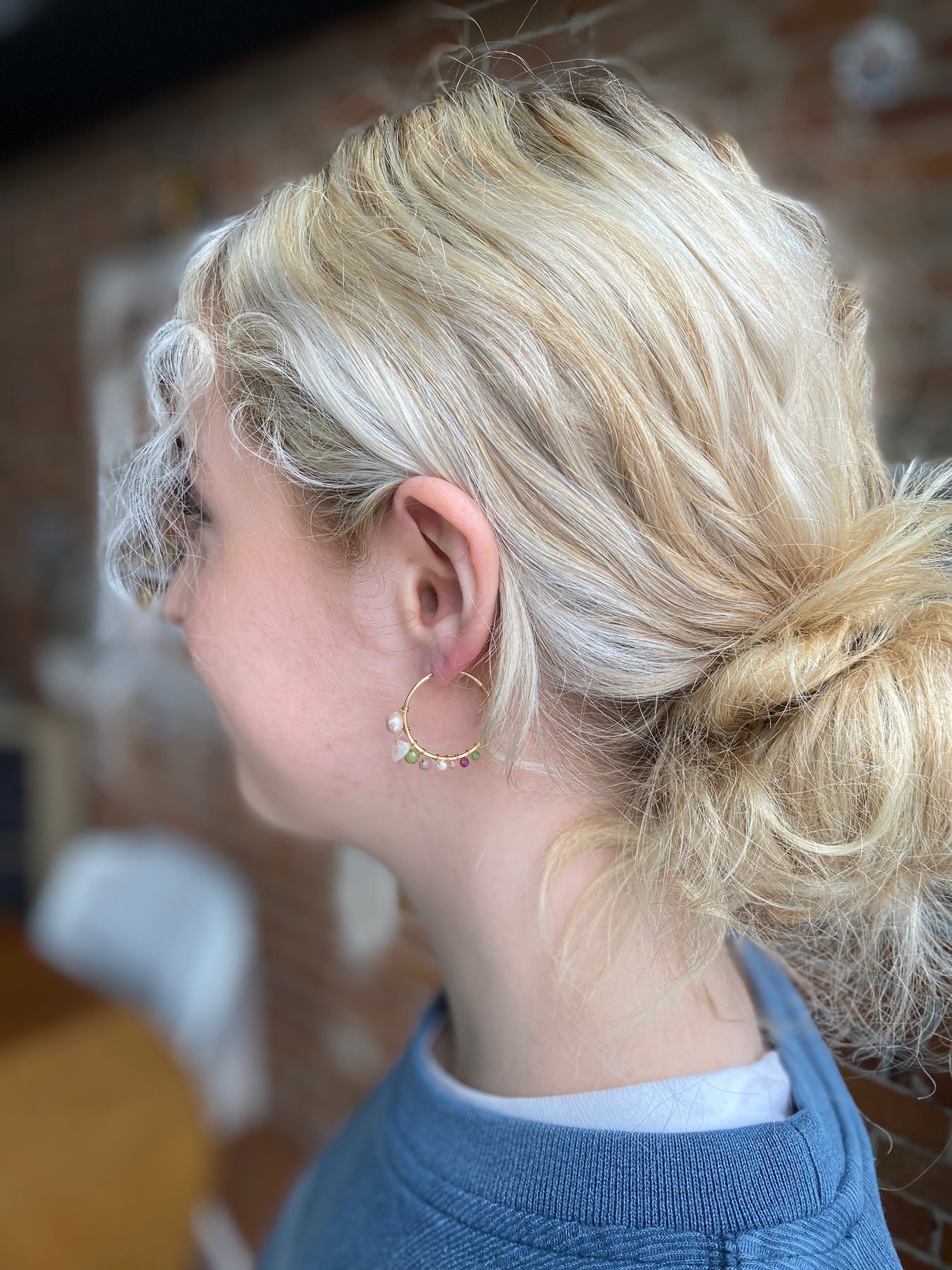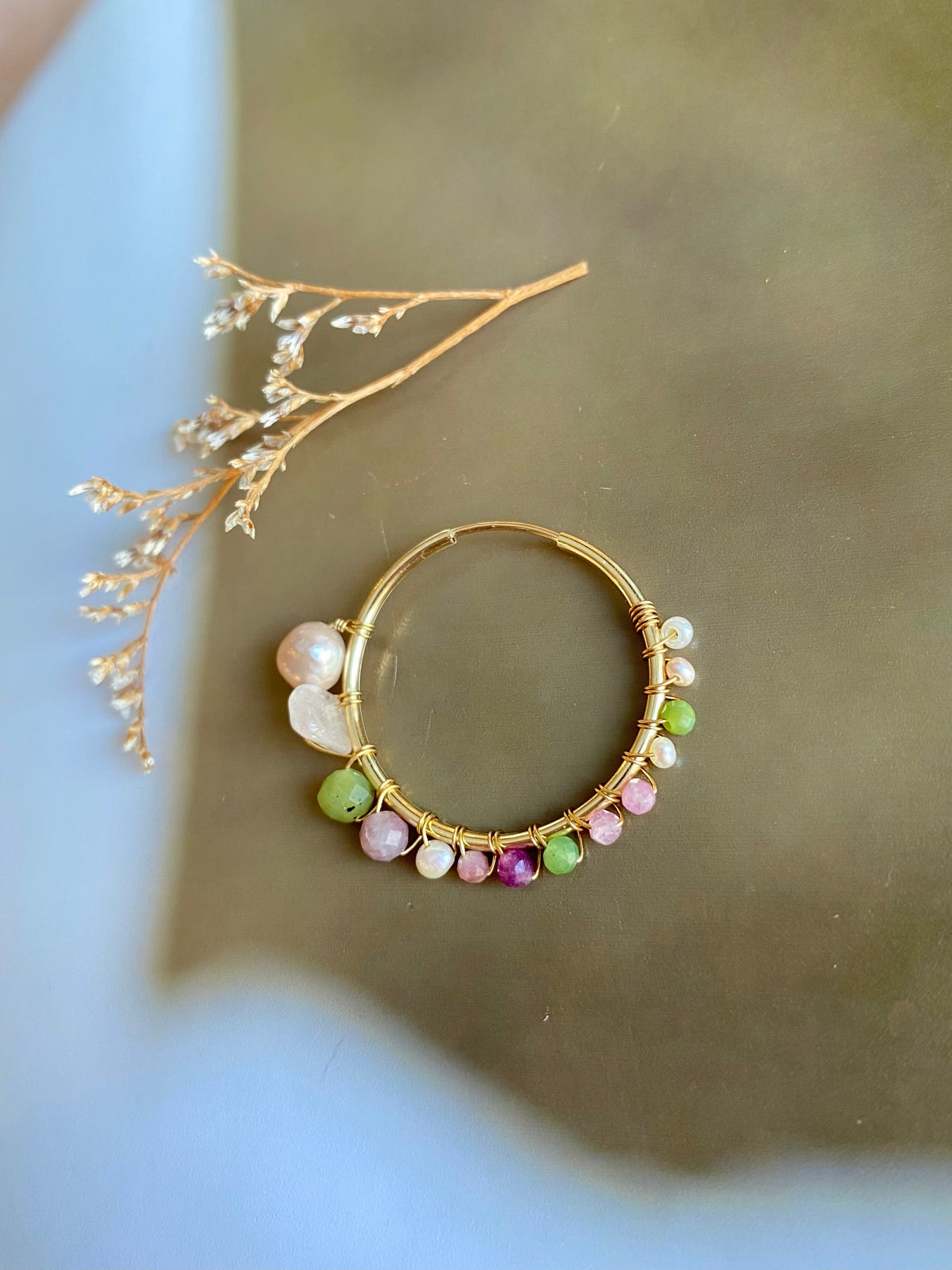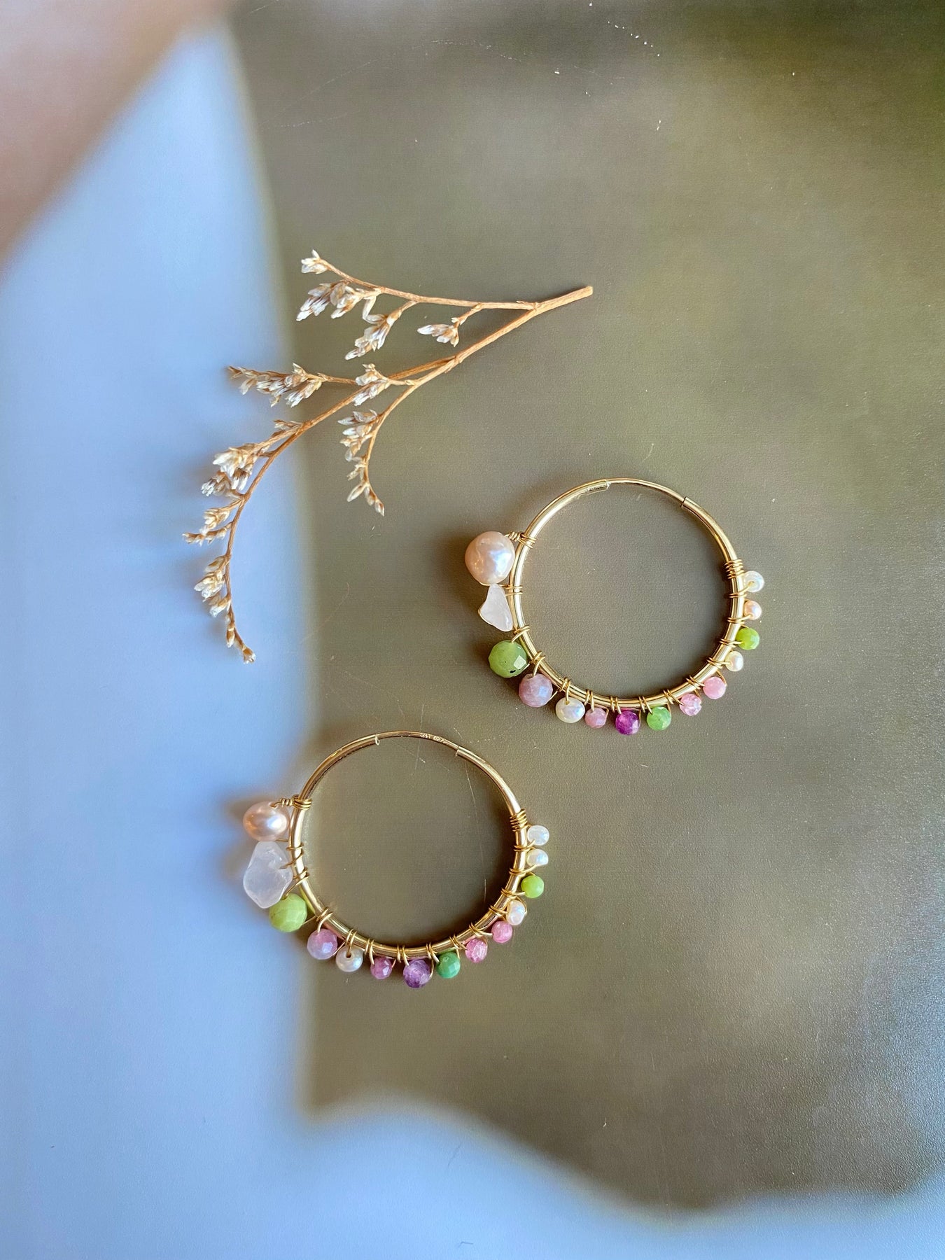 Soft petal pink and spring green will envelop you in protection and love when you wear these precious hoops.