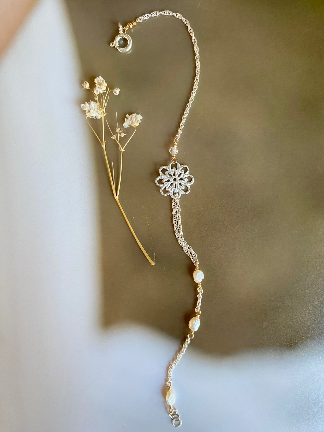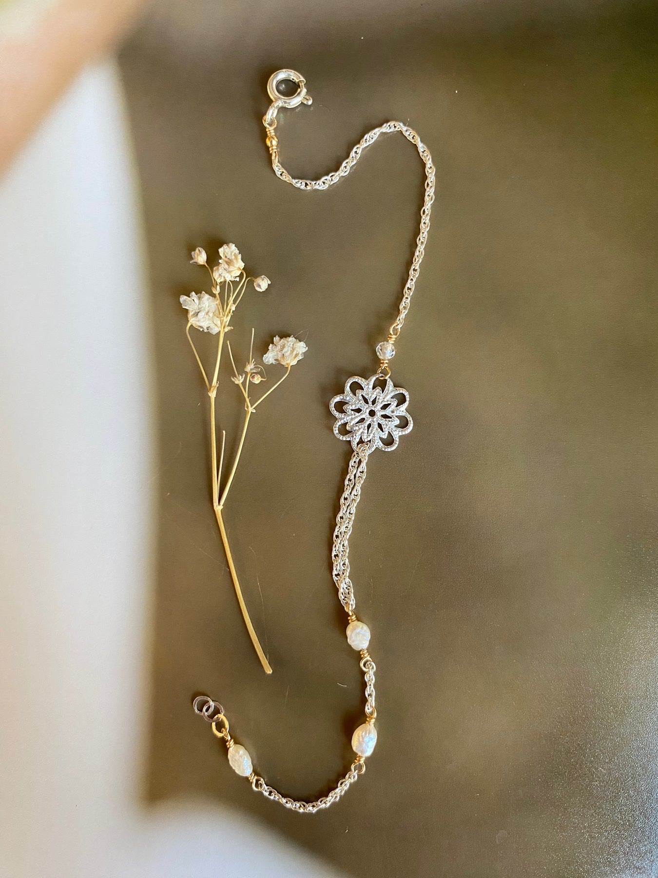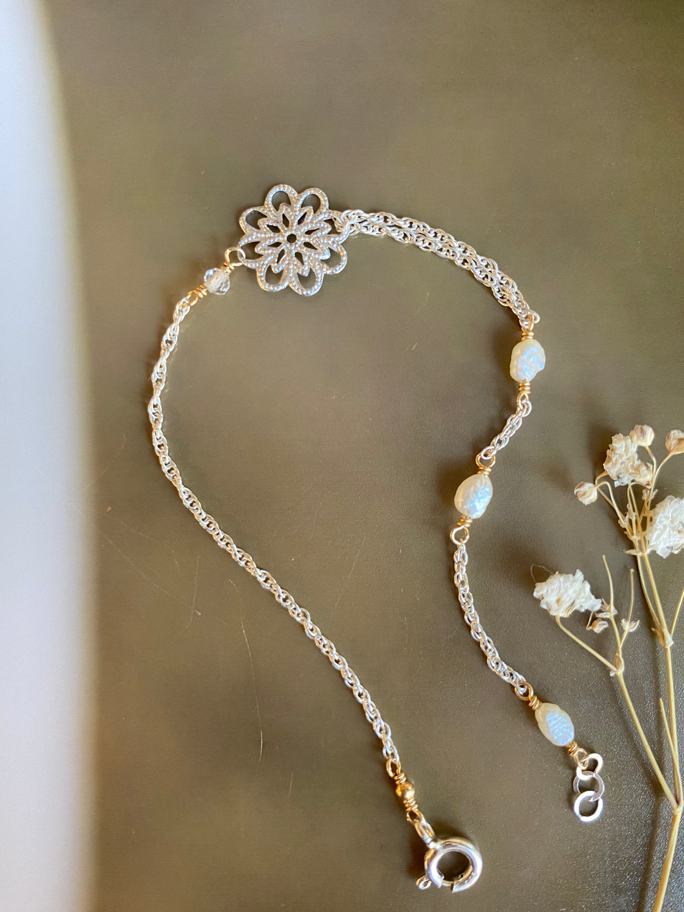 Delicate silver chains and soft pearls come together in a bracelet that feels light, romantic and quietly elegant.