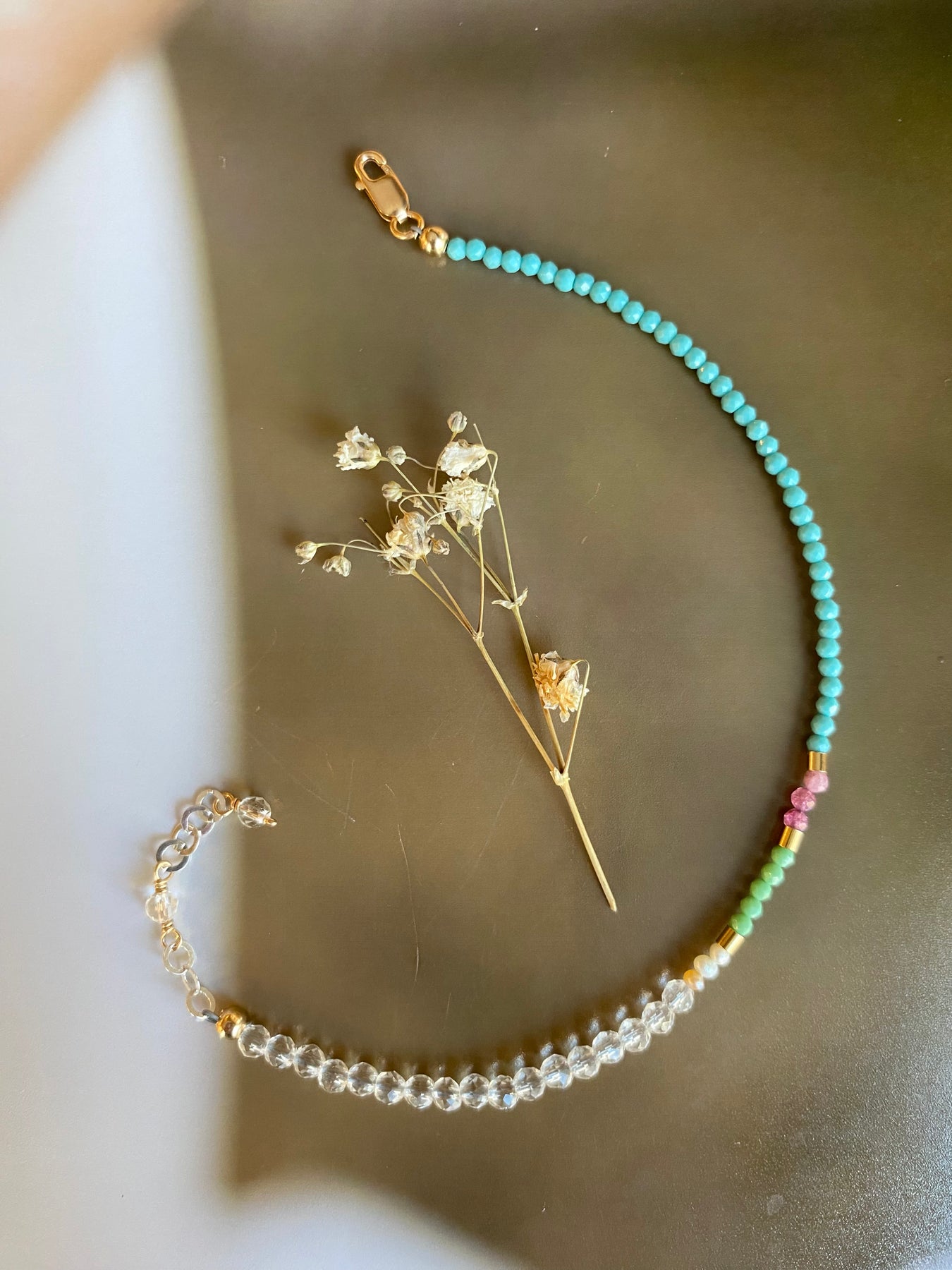 A soft meeting of colourful beads, crystal and pearl - like sunlight dancing on calm water.