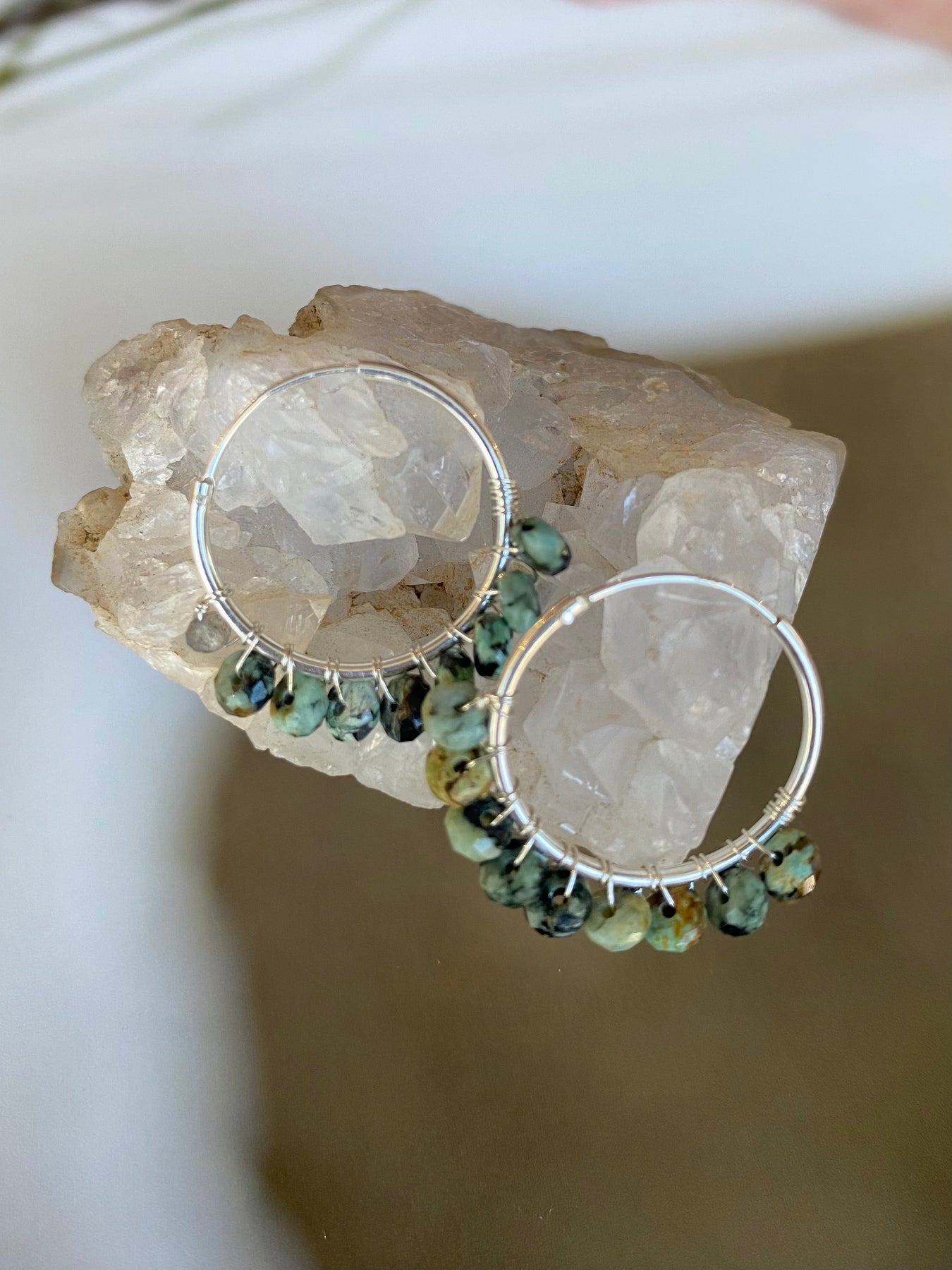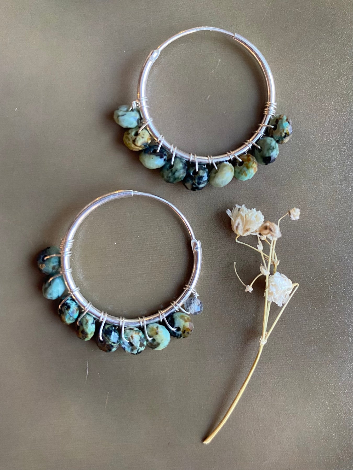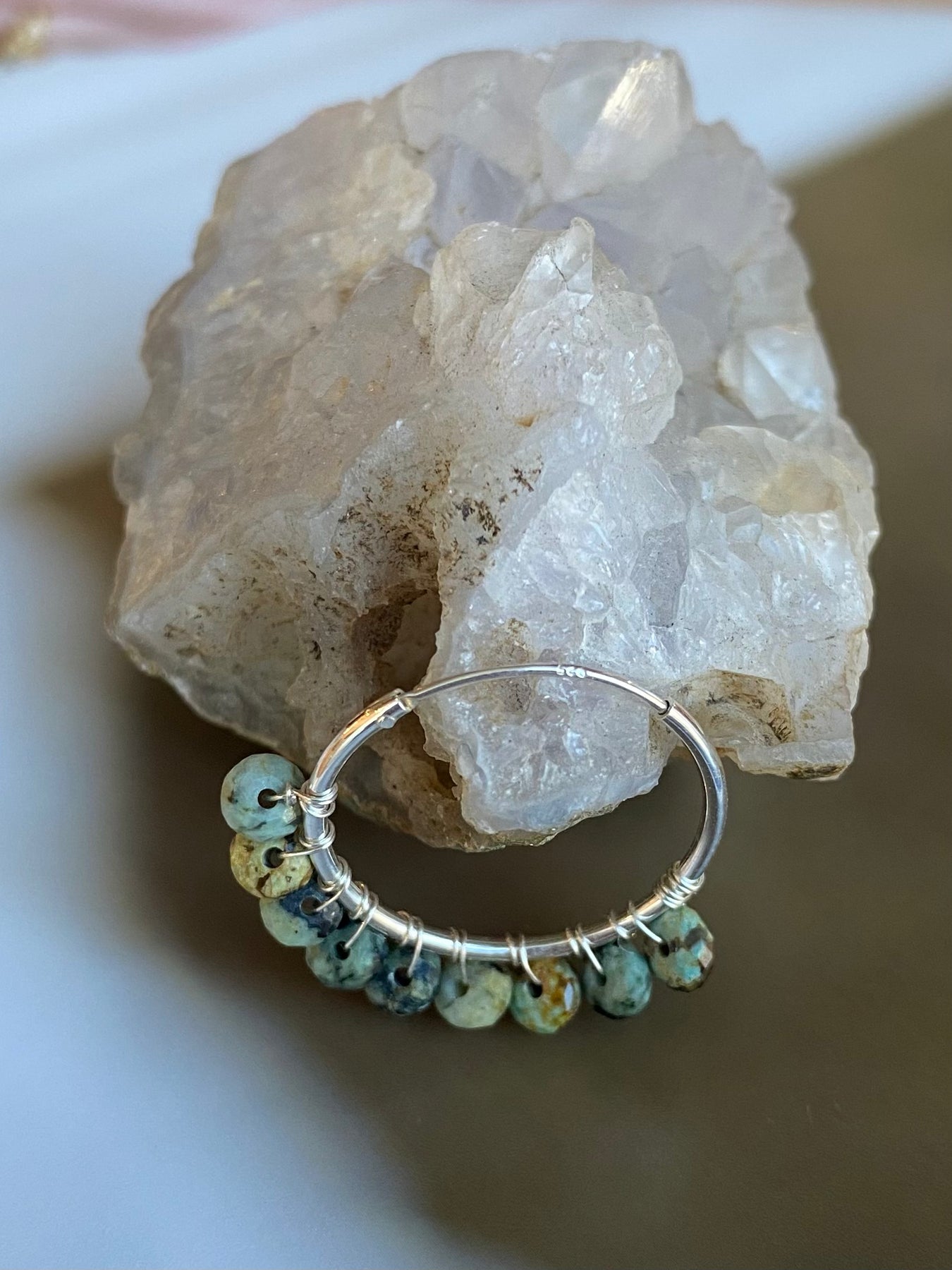 Softly scattered turquoise stones in ocean meets earth tones, designed to move with you.